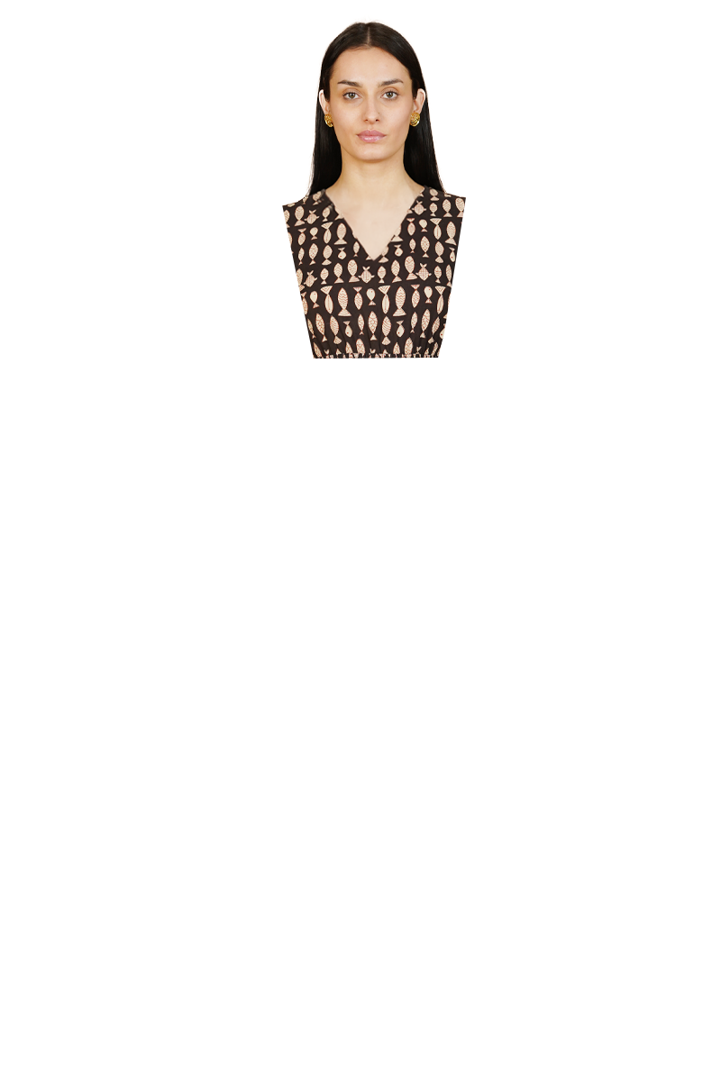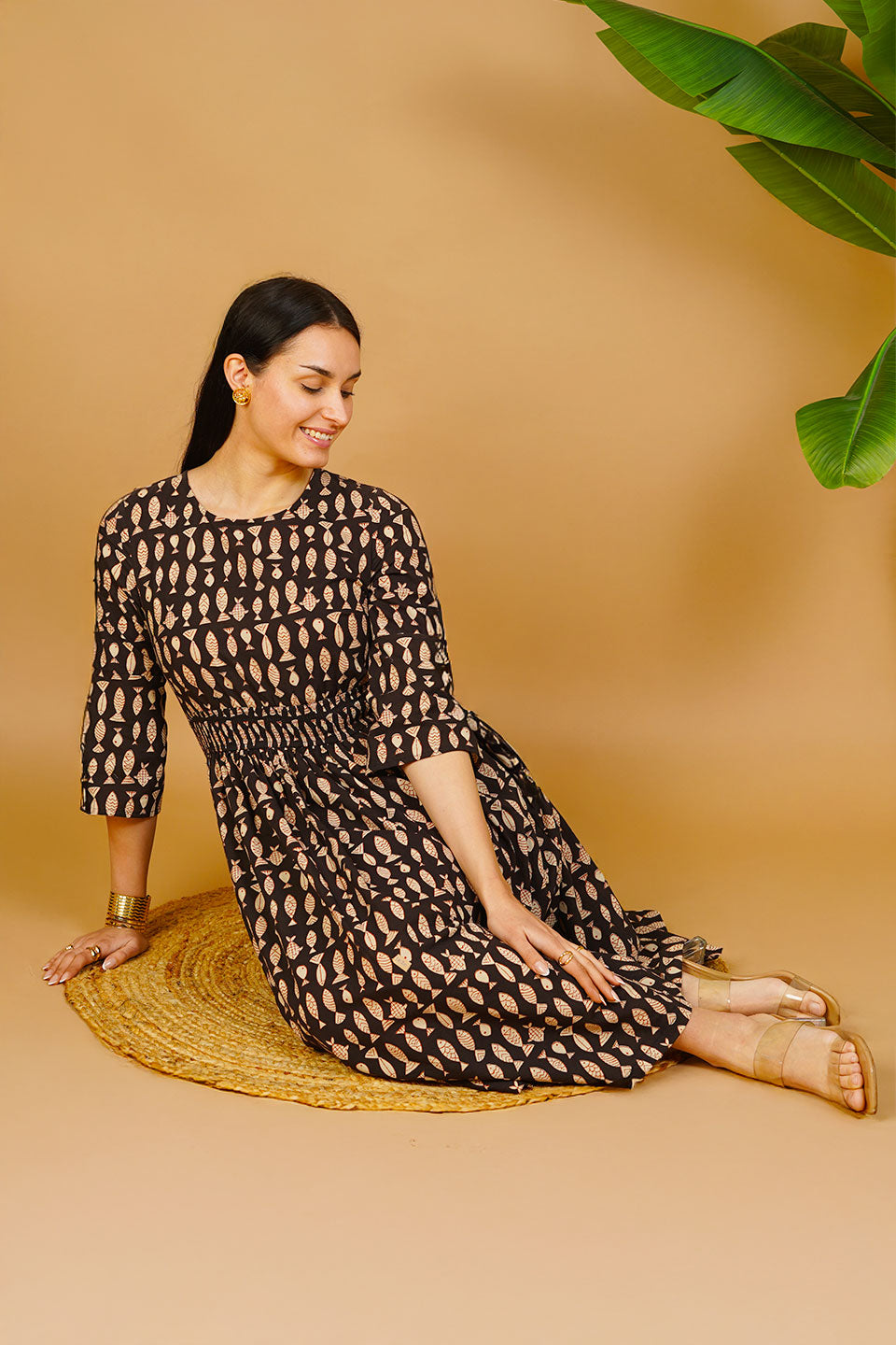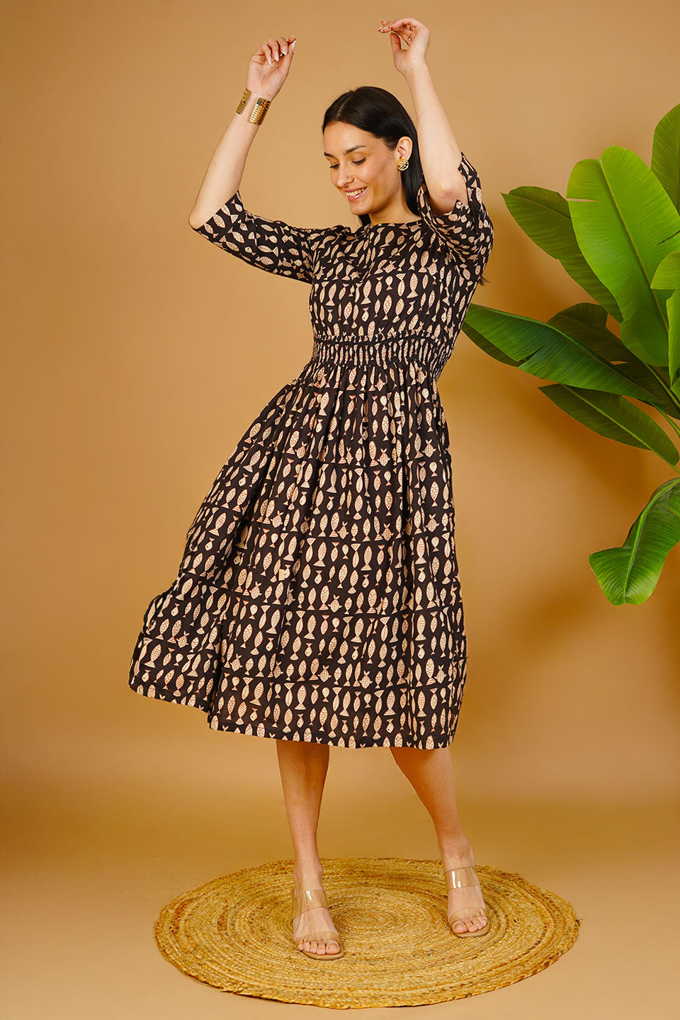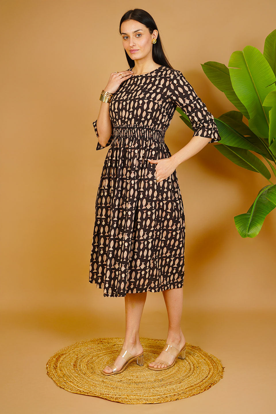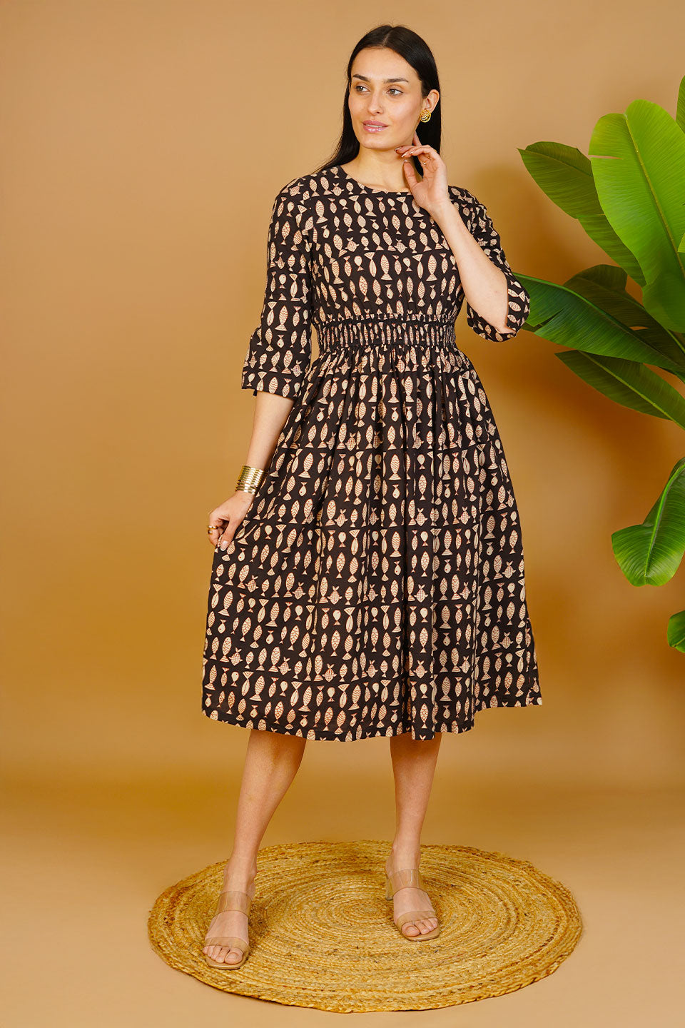 Black Bagru Cotton Midi Dress