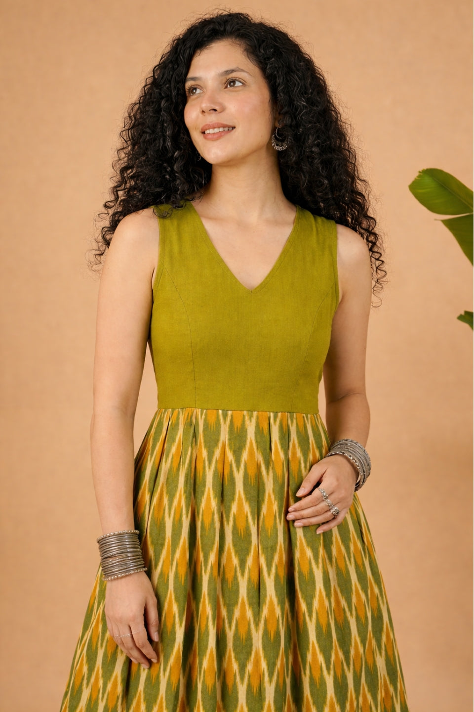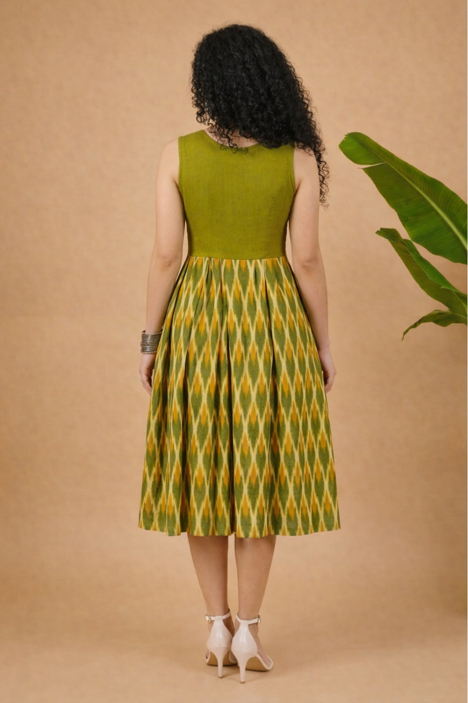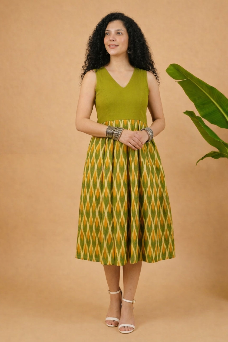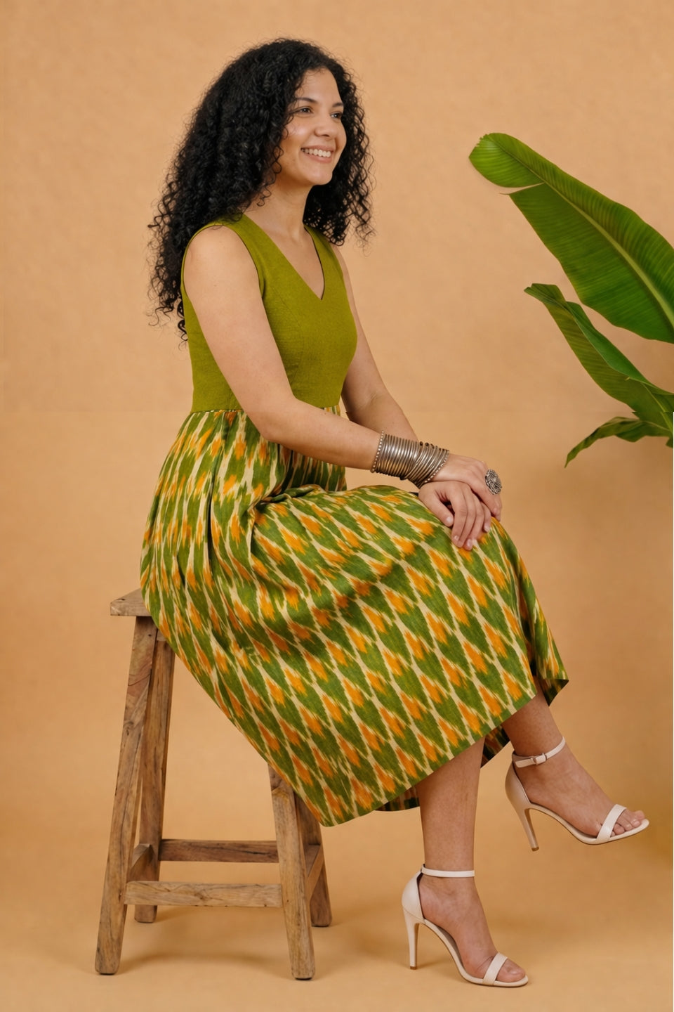 Green Ikat Midi Dress with Cotton Jersey Bodice